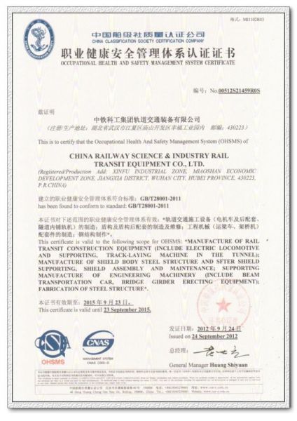 职业健康安全管理体系认证证书